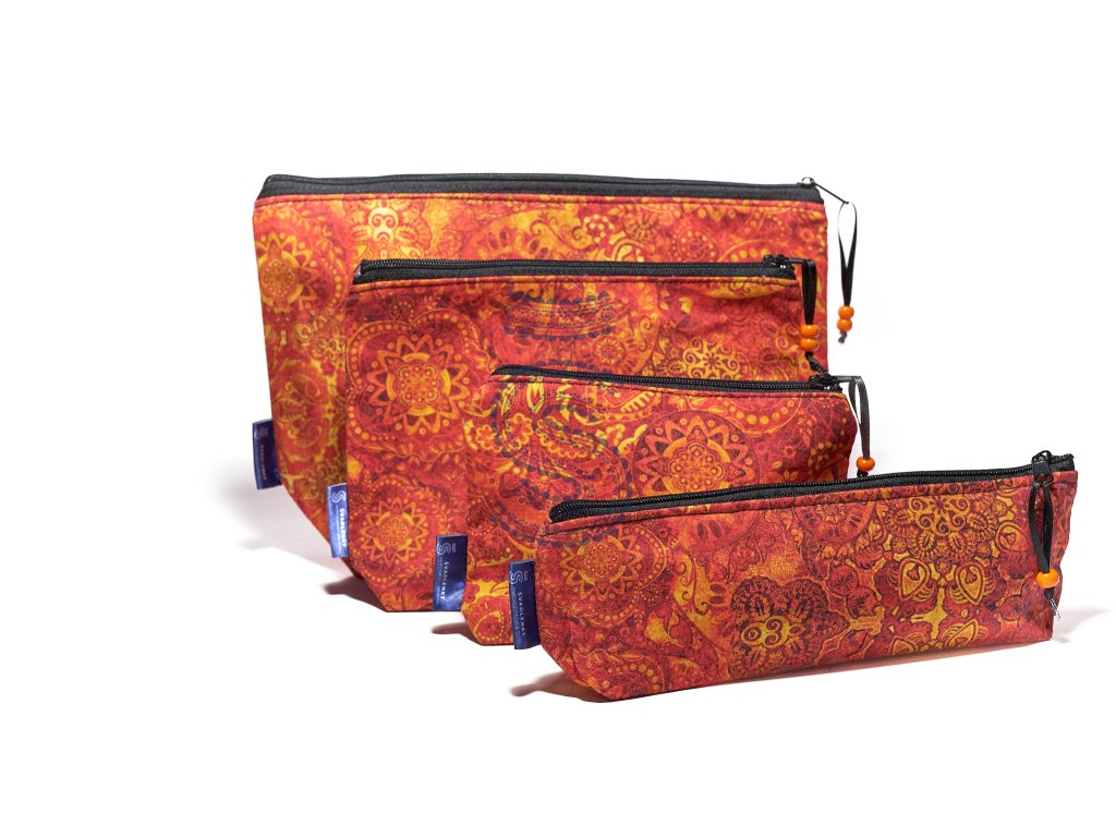 Penál i sadu kosmetických taštiček šijeme v Královéhradeckém kraji ze 100% bavlny Ombré. Látka si pohrává s duhovitým odstíněním sousedních tónů barvy, takže každý kus je originál. Vyplněné jsou vlizelínem - umělým materiálem, který jim drží krásný tvar. Ať už jedete kamkoliv.